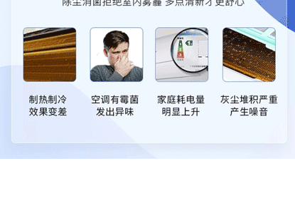 空調(diào)在使用一兩年后,會出現(xiàn)怪味,制冷效果下降,費電,出風量下降等諸多問題,人長期呆在空調(diào)房里會患空調(diào)綜合癥(頭暈、乏力、免疫力下降,俗稱空調(diào)病)這都是滯留在空調(diào)機蒸發(fā)器和室外機冷凝器里的大量污垢、細菌贅生物造成的,嚴重危害了人類的健康。
